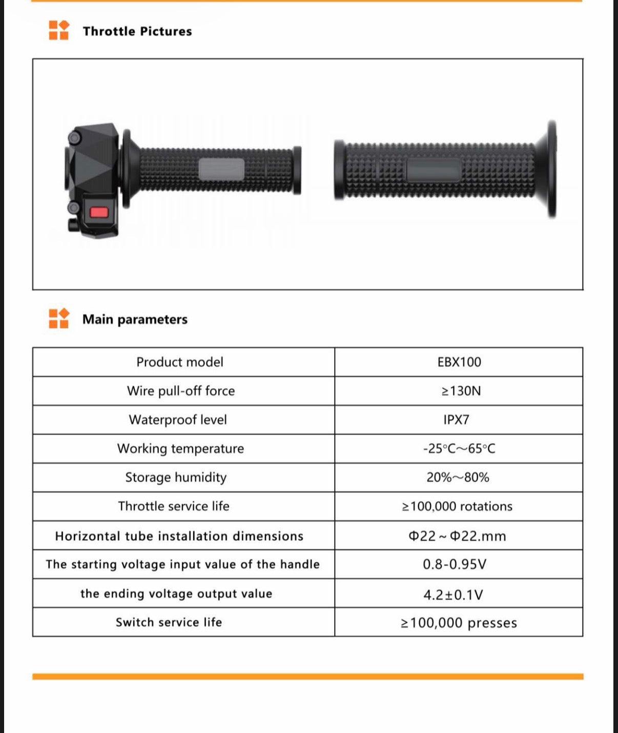 Product specifications table for a throttle system on a dark background
