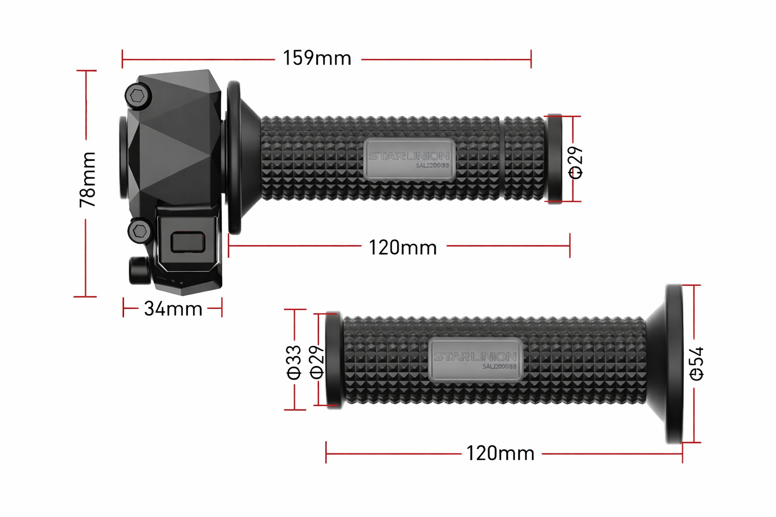 Black motorcycle grips with measurements on a white background